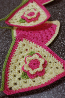 I had to complete a crochet project I've been working on - crocheted bunting for a 2nd birthday present for the youngest daughter of a good friend of mine.  I had great fun being able to do something really pink and girlie for once - one down-side of having a boy!  I was hugely inspired by things I'd found on some other blogs, added a bit of Mummy Lewis magic, and voila, completed bunting!!!  And I am so pleased with how it worked out!!!